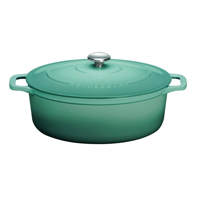 L’artisanat français est fier de vous prĂ©senter sa gamme de cocottes ovales en fonte ! Chasseur vous propose une cocotte de 33 cm de diamĂštre en fonte Ă©maillĂ©e pour mijoter des plats plus bons les uns que les autres !