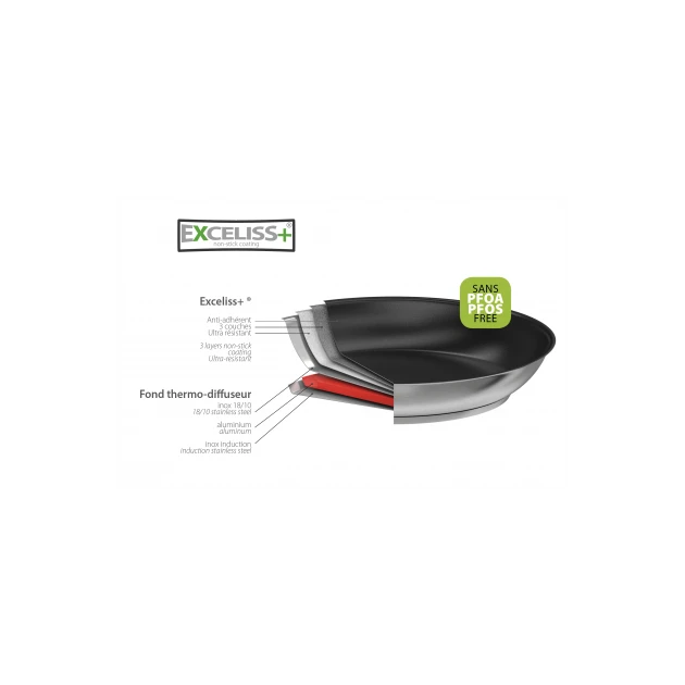 La poêle anti adhérente Exceliss est un synonyme de qualité et de robustesse. Son corps est en inox tandis que son fond est composé d’une couche qui diffuse la chaleur de façon idéale, et d’un revêtement sans pfoa.